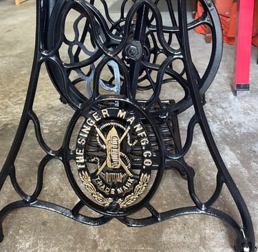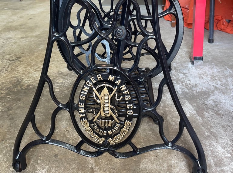 To take the restoration a step further, I repainted the iron treadle base and hand-applied genuine gold leaf to the raised "SINGER" lettering and the ornate trademark emblem. This highlights the incredible 1910s craftsmanship and turns the iron stand into a work of art.